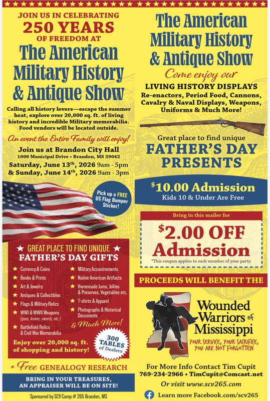 Our Camp's 1st American Military History & Antique Show will be held June 13th & 14th, 2026 at the Brandon City Hall/City Complex in Brandon, MS. We have renamed our show to coincide with our country's 250th anniversary. It is our first military history and antique show but it is the 11th annual relic / antique show that we have had the opportunity to put on. Our past shows catered to only Civil War history but we are expanding our exhibits to include all wars that the United States has been a participant in.